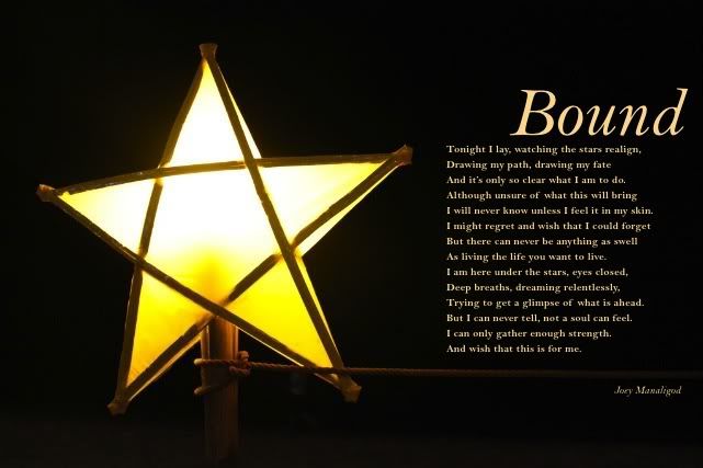 I finally won something! Woohoo! I hope I win a car next time. Mehehe. Anyway, I had my poetry presentation this morning. So we were supposed to present a poem of our choice, discuss its form and all that jazz, then make a response to it in a form of a poem as well. I made a response to one of my favourite poems, "The Road Not Taken" by Robert Frost. And my response is entitled "Bound". I wrote this last night. I was having a hard time writing so I had to go sit by the window and write about it first before actually coming up with a poem.